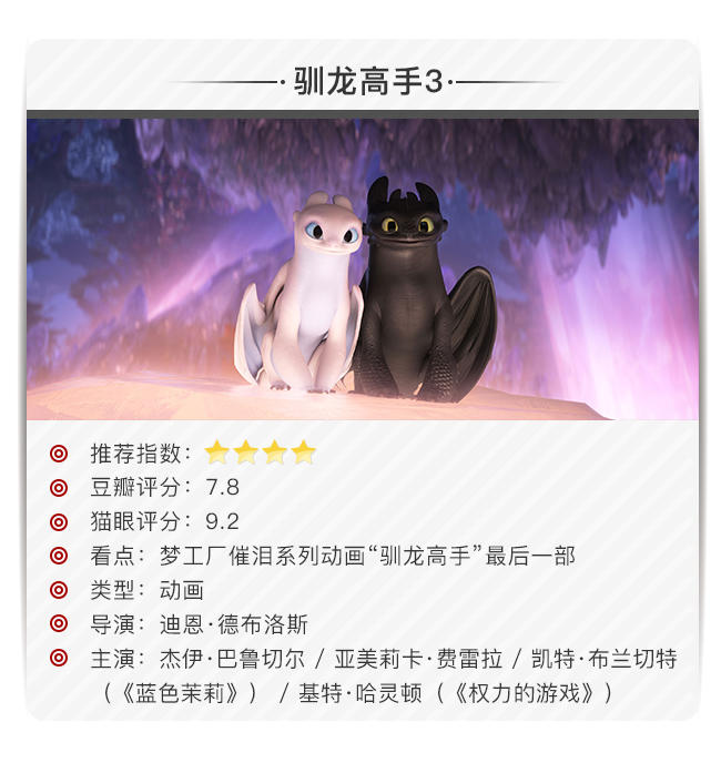本周依然新片不多但质量不错。一部是刚刚拿了奥斯卡最佳影片的《绿皮书》,一部是驯龙高手系列最后一部《驯龙高手3》。