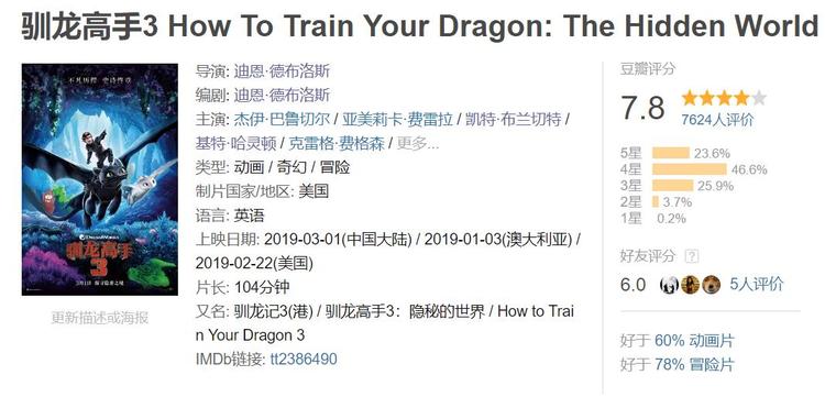 《驯龙高手3》目前的豆瓣评分是7.8分,而第一部和第二部的评分分别是8.7和7.9分。