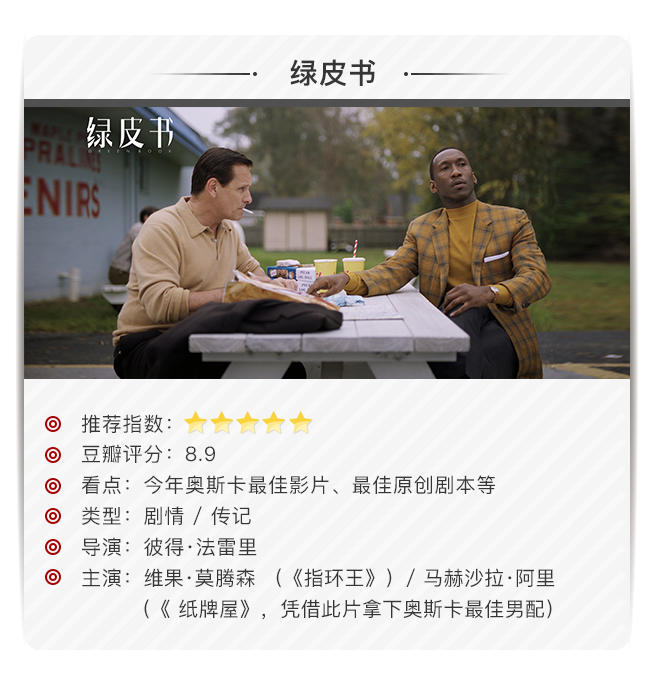 2月25日,《绿皮书》拿了今年奥斯卡最佳影片、最佳男配、最佳原创剧本、最佳男主和最佳剪辑五项大奖项的提名,并最终拿下了前三个奖项。