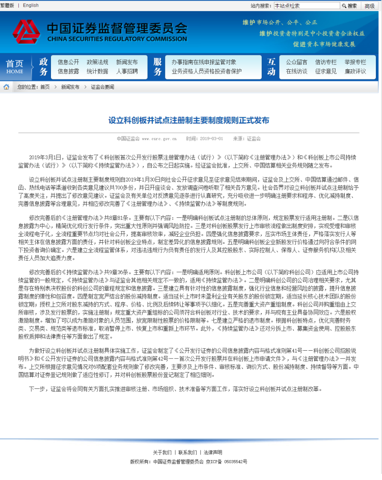 3月1日深夜,证监会发布了《科创板首次公开发行股票注册管理办法(试行)》和《科创板上市公司持续监管办法(试行)》,自公布之日起实施。经证监会批准,上交所、中国结算相关业务规则随之发布。