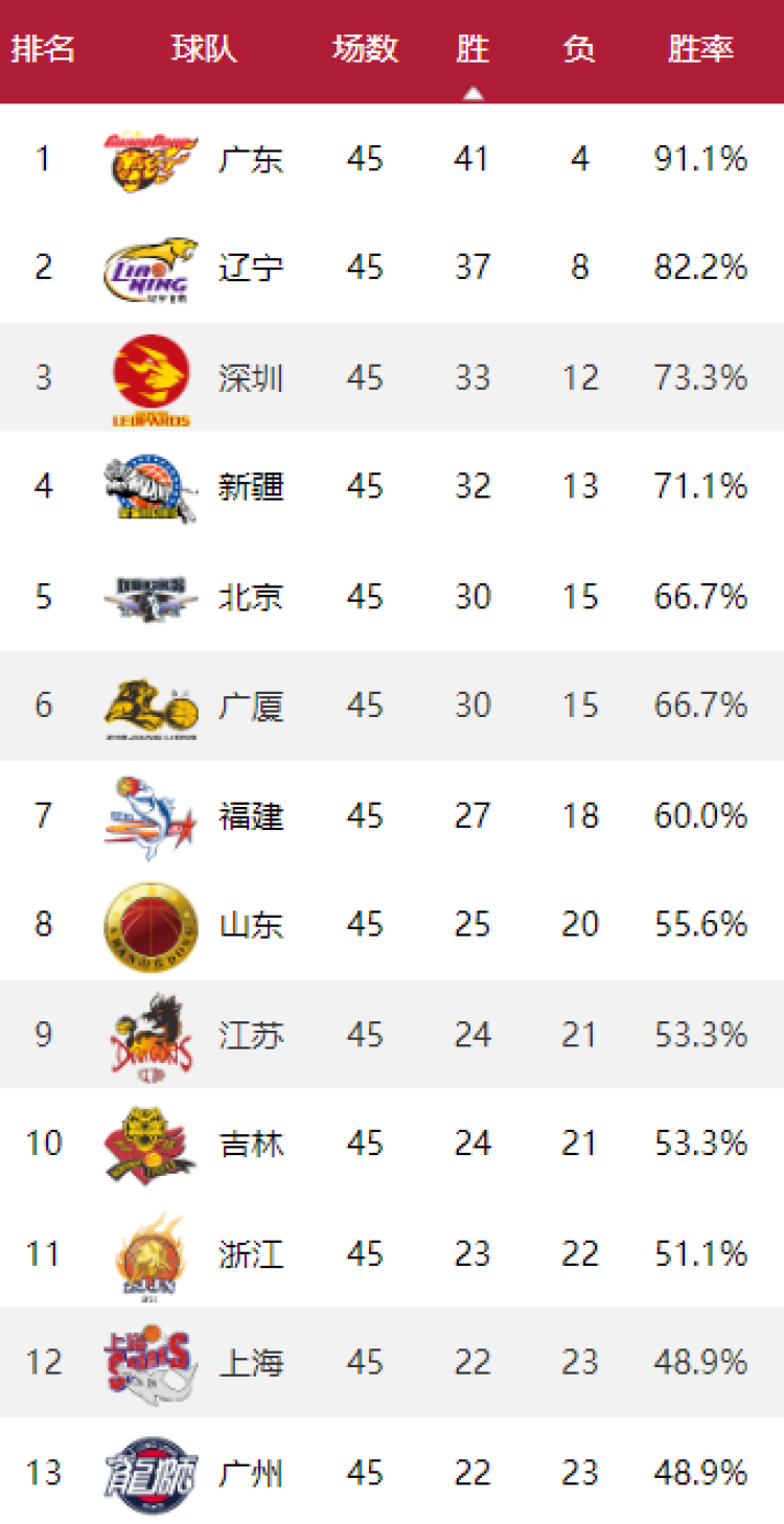 截止CBA常规赛第45轮,锁定季后赛名额的球队已经达到11支,其中广东和辽宁锁定积分榜前两名、福建和山东则确定第7、第8名,深圳将与新疆争夺3-4名,北京将和广厦争夺5-6名,而吉林、江苏和浙江争夺9-11名。