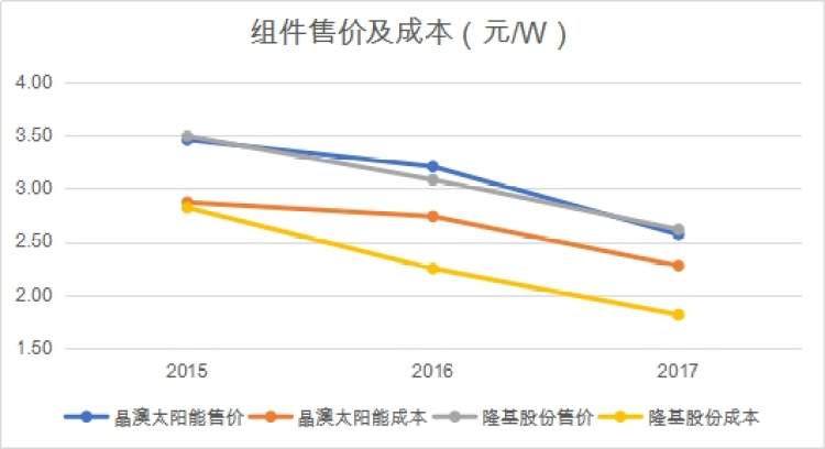 在光伏产业链中,太阳能电池片与太阳能电池组件是产业链中差异最小、毛利最低的环节。根据晶澳太阳能在美国上市期间披露的年报计算,其组件产品2015-2017年的售价分别为3.46元/W、3.21元/W、2.57元/W,其组件产品2015-2017年的成本分别为2.87元/W、2.74元/W、2.27元/W。与光伏产业中的龙头企业隆基股份相比,晶澳太阳能组件产品的单位售价差异不大,而其单位成本在2017年则高出隆基股份25.5%,即0.46元/W。请标的公司结合数据说明,面对激烈的市场竞争,晶澳太阳能组件产品的成本在同行业中是否具有竞争优势,并说明公司在降低产品成本、提升效率方面的具体计划。