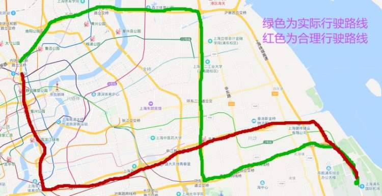 而交通执法人员告诉记者,此差业务的合理行驶路线应该是上海火车站-南北高架(卢浦大桥方向)-中环-华夏路高架-浦东机场,费用大概在180元左右。