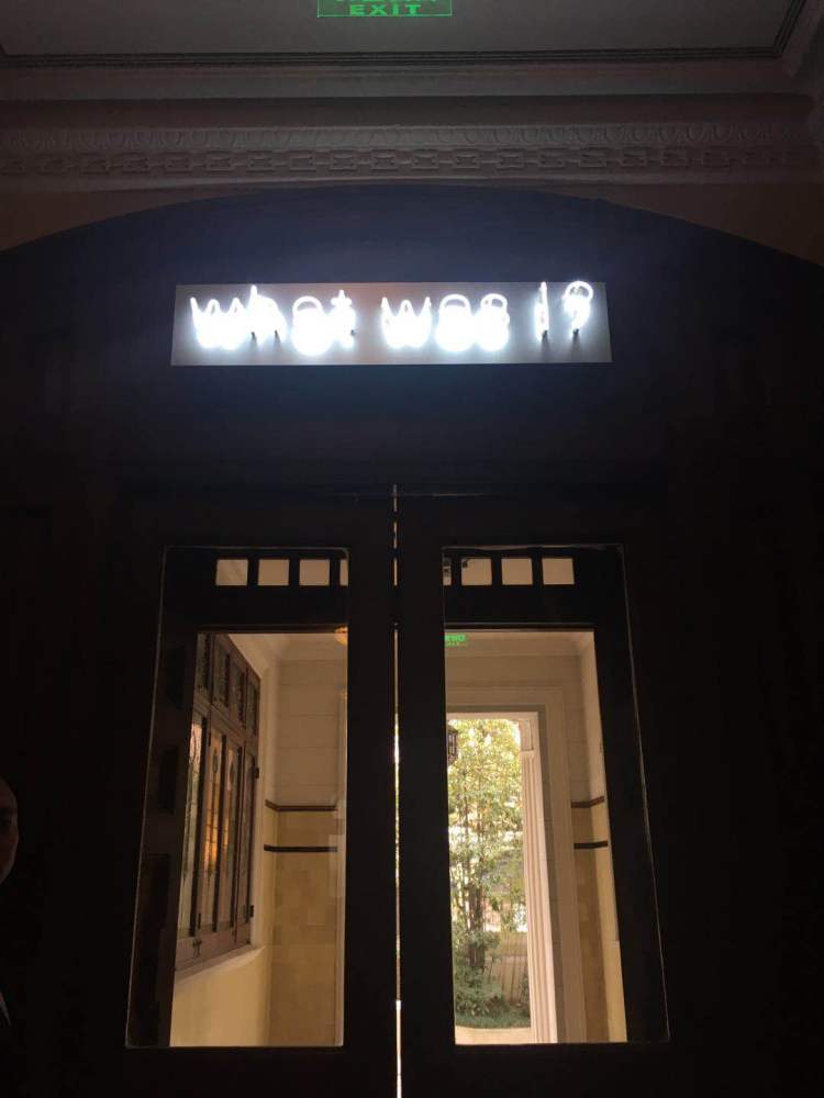 一个霓虹灯装置作品“我曾为何物?”被安装在了荣宅出口处的门楣上方。