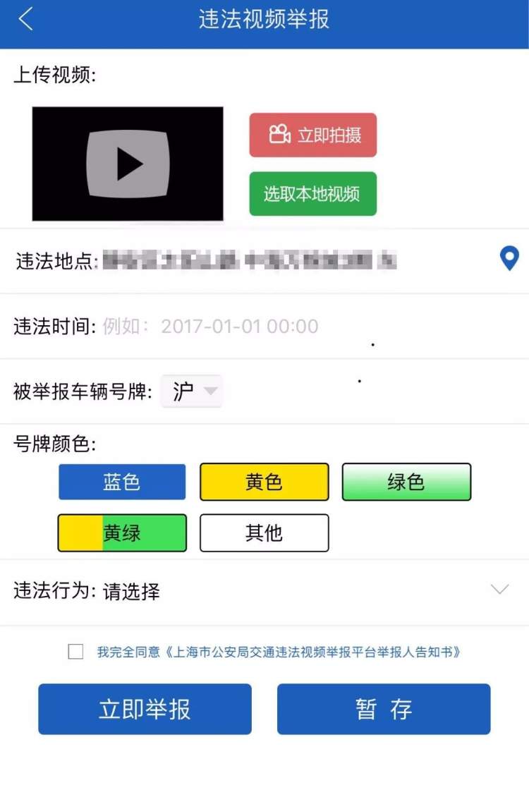 通过“上海交警”APP的违法视频举报页面,用手机直接拍摄交通违法视频或选取本地视频,并将其上传,同时填写地点、违法行为等信息完成举报。受理情况及历史信息可在主界面“我的”栏目中查询。
