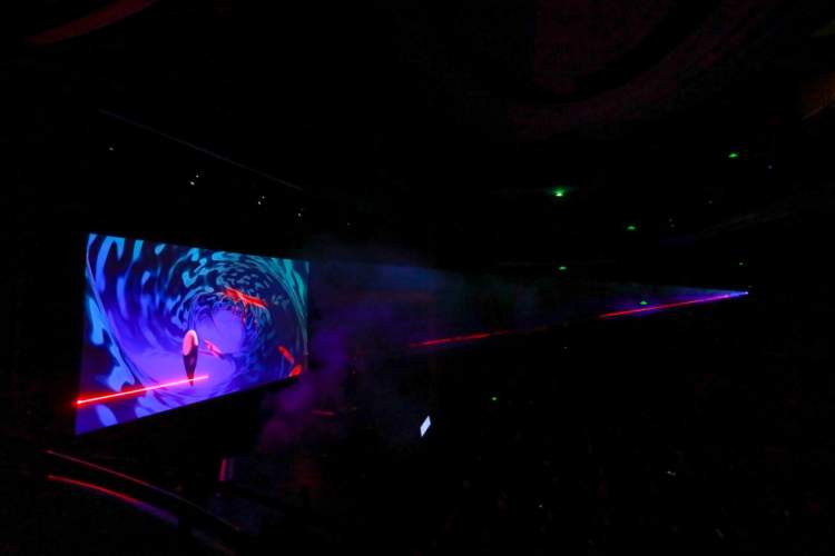 3台高功率激光发射器在智能程序的驱动之下,穿过空气中的薄雾,与现场的画面结合形成一个混合的分层的多维空间。