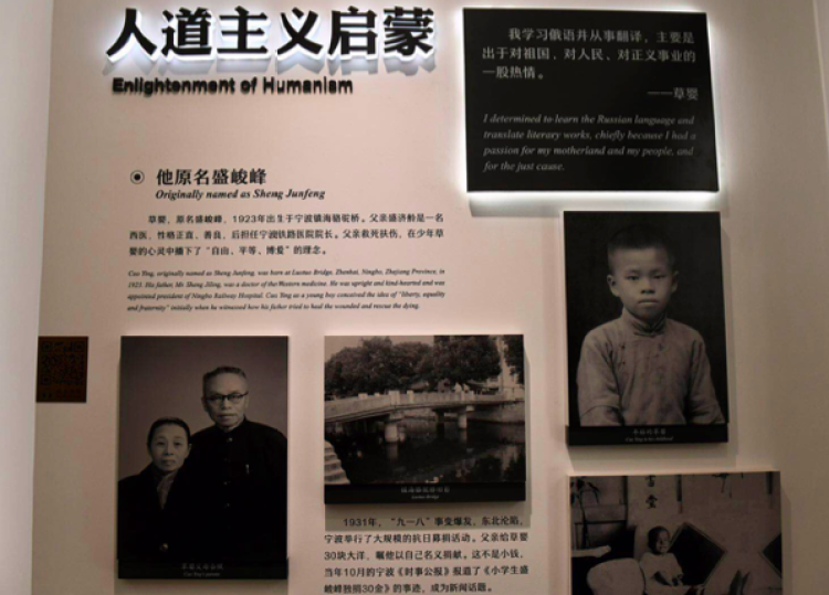 展示柜中,陈列着草婴翻译过的原版书籍、手稿原件。