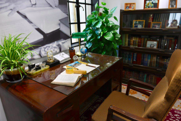 踏入新落成的草婴书房,书桌、沙发和书橱还原了草婴先生的生前“一个人的翻译马拉松”的工作场景。