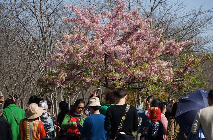 不过呢,衔接早中樱的飞寒樱、小彼岸等等品种开得倒是很灿烂,就是乍一看上去还不成规模,没有大片大片樱花林的feel,不少游客和周到君一样,逮着开得灿烂的樱花树、樱花林就特别珍惜,各种凹造型拍照片~