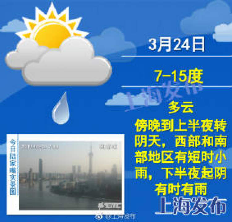 今天白天多云,最高15℃,傍晚起局部有短时小雨 上海发布 2019-3-24 来源:周到上海 今天继续好天气!! 白天多云,傍晚到上半夜转阴天,西部和南部地区有短时小雨,7-15℃。今天下半夜起阴有时有雨,晚归的朋友注意带伞哦! 明天阴有短时小雨转阴到多云,预计下周雨水阵阵,气温将有所回升,周二、周四最高温都可超过20℃哦! 空气质量也是很不错的哦。今早7时全市PM2.5平均浓度为22微克/立方米。最高的青浦淀山湖为58,最低的普陀监测站为16,实时空气质量指数47,优。 来源:周到上海 作者:上海发布 赞一个 (0)