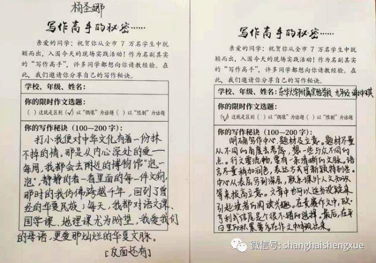现场实践活动在上海外国语大学附属大境中学举行。实践现场,小选手们还动手写下了自己在语文和写作方面的学习心得▼
