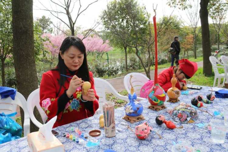 在“花开海上”生态园门口,朱泾花灯、传统剪纸、葫芦画、手工绢花、竹编艺术、金山农民画、纸蕾丝、串珠制作等传统文化、非遗文化项目,吸引了广大市民游客参与文化体验。