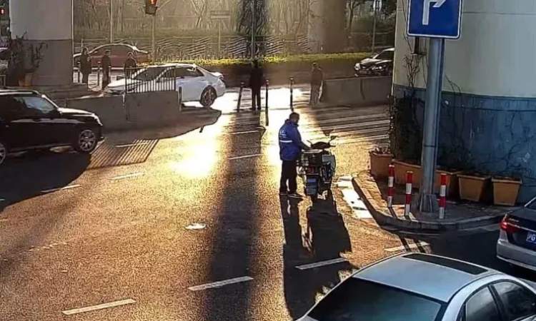 然而,就在民警赶赴现场时,一名路过的快递小哥已经先行赶了过去,只见他弯下腰用力将沉重的窨井盖推回原位,然后回到路边,准备离开现场。
