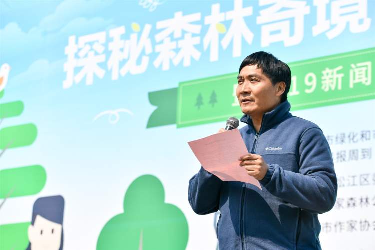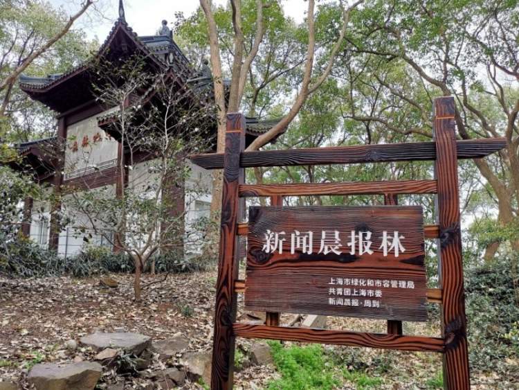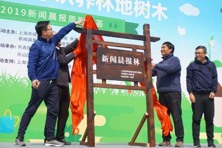 佘山脚下,市绿化局副局长顾晓君、团市委副书记丁波、新闻报社党委书记、社长黄琼、上海市作家协会党组书记王伟为新闻晨报认养林揭牌。