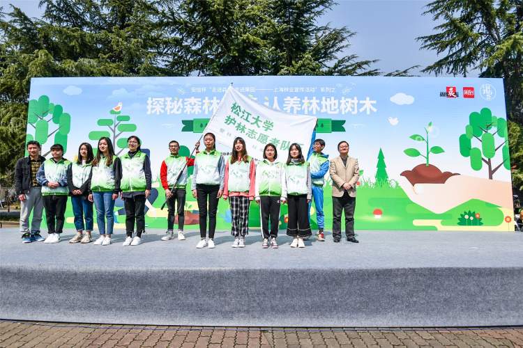 在佘山脚下,市绿化和市容管理局林业处陶丹、松江团委书记丁汀为松江大学城护林青年志愿者队伍授旗,春荟结束后,这支志愿者队伍将在佘山国家森林公园捡拾垃圾,共同爱护我们的森林家园。