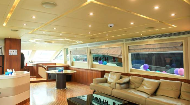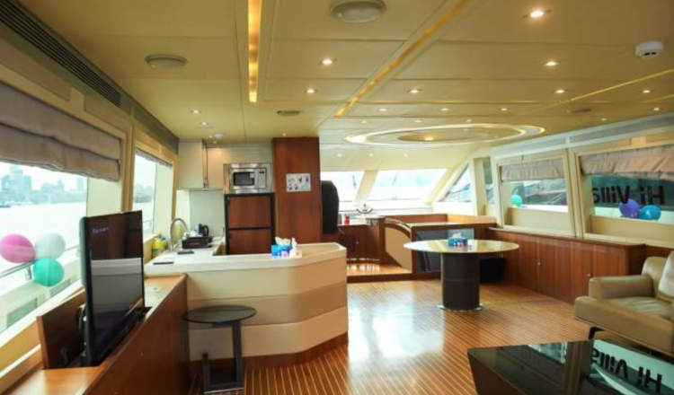 特别定制的KTV娱乐设施为聚会派对提供个性化体验;前甲板开辟大沙发区,更加注重亲水性;飞桥上的休闲区,不仅增加足够的活动空间,也带来开阔的视野;欢墅的管家服务贯穿始终,身穿笔挺制服的欢墅管家穿梭于人群中,为宾客送上香槟和甜点,成为这艘游艇的一大亮点。