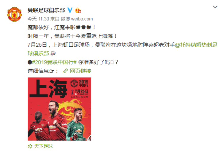 北京时间3月27日,据曼联官方消息称,今夏曼联将来到中国上海,于7月25日在虹口足球场迎战热刺。
