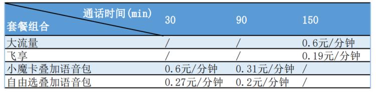 从图中可见,如果你不需要很多流量,大流量套餐的性价比实在太低。第一选择是最纯粹的“自由选套餐叠加国内语音包”——通话时间30分钟,资费相当于0.27元/分钟;通话时间90分钟,资费相当于0.2元/分钟。