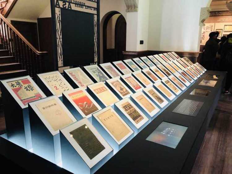 拾步而上,一楼大厅内,夏衍不同时期的代表作被制作成书阵摆放在醒目的中间位置。整个展示,以夏衍具有“红色文化”“海派文化”特质的历史事件为主线,梳理、回顾他在上海加入中国共产党、开始革命工作;筹建左联,创刊《救亡日报》,参与隐蔽战线工作;翻译《妇女与社会主义》《母亲》等著作;创办左翼剧社,创作话剧《上海屋檐下》、电影《风云儿女》,筹办《光明》刊物,发表报告文学《包身工》等历程。