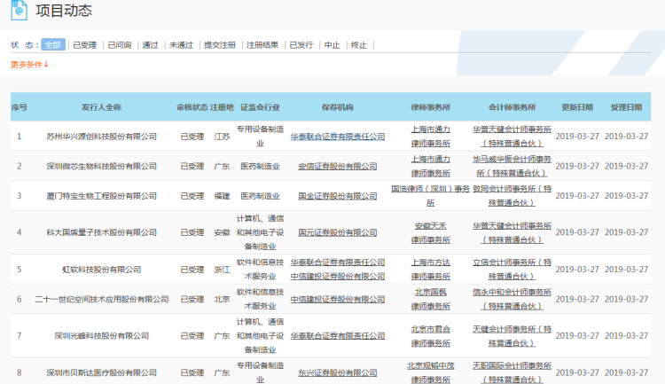 27日,上交所受理八家企业科创板上市申请,包括苏州华兴源创科技股份有限公司、深圳微芯生物科技股份有限公司、厦门特宝生物工程股份有限公司、科大国盾量子技术股份有限公司、虹软科技股份有限公司、二十一世纪空间技术应用股份有限公司、深圳光峰科技股份有限公司、深圳市贝斯达医疗股份有限公司。至此,两批科创公司受理企业共17家亮相。