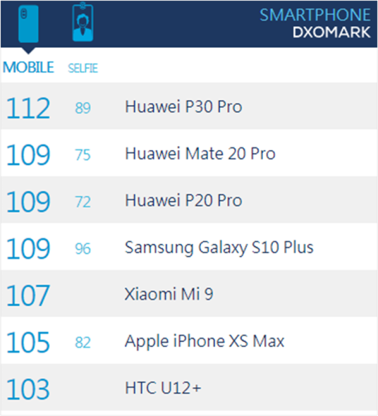 据周到君统计,在DxO相机拍照总榜上,前十强有六款中国手机上榜。分别是华为P30 Pro,华为Mate 20 Pro,华为P20 Pro,华为P20,小米9与小米MIX3。