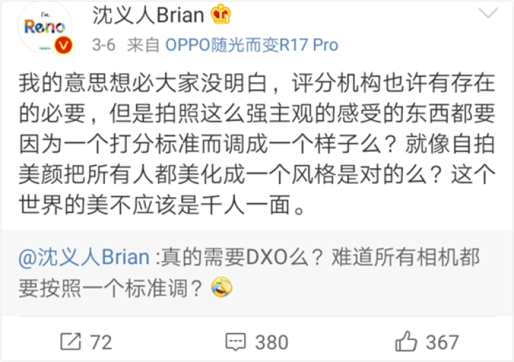此前3月初,OPPO副总裁沈义人针对DxO榜单发声,认为手机拍摄无需定下客观标准,应该是千人千面。