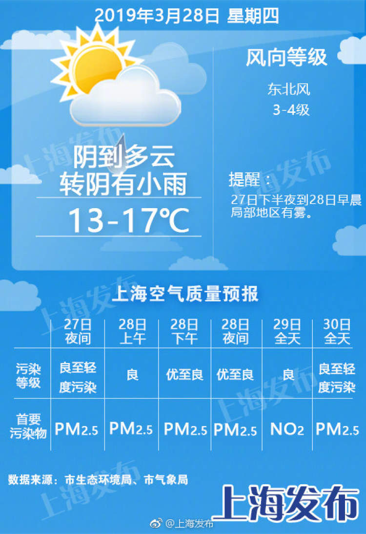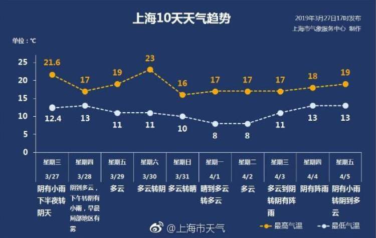 明天继续下雨,周末或放晴!周六升到23℃,周日骤降至16℃! 周到君 2019-3-27 来源:周到上海 周三魔都的天气不错,白天最高温亦达21.6℃,但午后天空渐渐阴沉,并伴有雨水。 周四的天气与周三相仿:阴到多云,下午转阴有小雨,13-17℃,仍然会有雨水,所以各位小伙伴务必带好雨伞啦。另外,周三下半夜到周四早晨局部地区有雾。 本周后期天气好转,周五和双休日以多云天气为主。周六最高气温回升至23℃,但周日又降至16℃。最近气温波动频繁,请大家注意不要感冒啦~另外,本周双休日将迎来清明扫墓出行的高峰,就目前来看,双休日上海天空状况还不错。 来源:周到上海 作者:周到君 赞一个 (0)