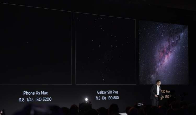华为消费者业务总裁余承东介绍,P30系列在几乎全黑暗的情况下,都能够拍摄出无比清晰的图像。他甚至现场演示了一组由iPhone XS Max、三星Galaxy S10+和华为P30系列分别拍摄的星空。