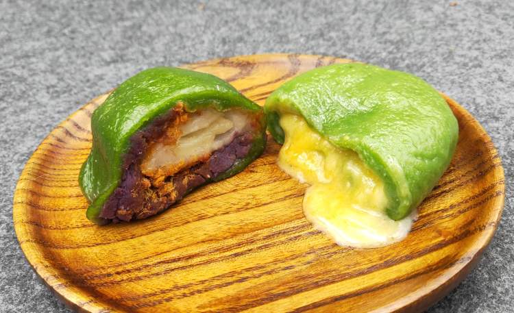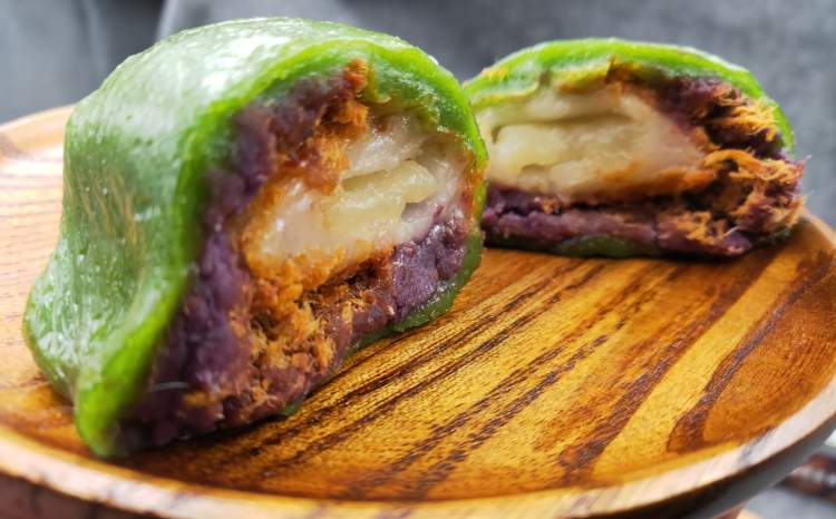 其中Q心奶香紫薯肉松青团也可以叫做“五色青团”,意思是一口咬下去能看到五种颜色。