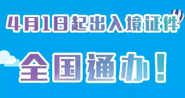 自2019年4月1日起,中华人民共和国普通护照、往来港澳通行证、往来台湾通行证等出入境证件实行“全国通办”,即内地居民可在全国任一出入境管理窗口申请办理上述出入境证件,申办手续与户籍地一致。