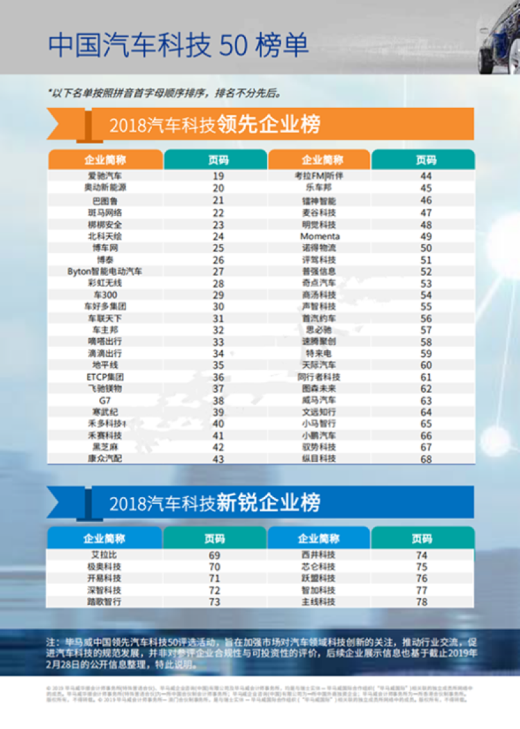 毕马威日前发布《2018年暨第二届中国领先汽车科技企业50榜单》。本届榜单中。智能网联类公司占比较高,包括10家入围新锐榜的企业。地平线、寒武纪、商汤科技、禾赛科技、小鹏汽车、威马汽车等在列。