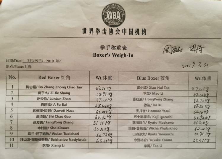 北京时间明晚19:00,“第四届中日拳王争霸赛”将在上海普陀体育馆进行。今天下午,乌兰、拜山波、木村翔领衔的12位参赛拳手在上海新华联索菲特大酒店顺利通过了赛前称重仪式。