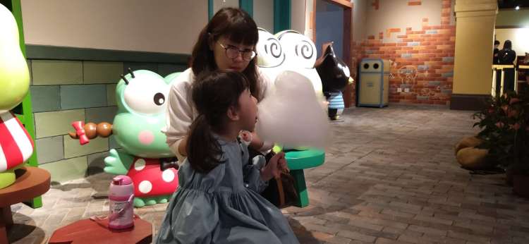 环绕摄影门口,小女孩好奇地走入Hello Kitty“隧道”。