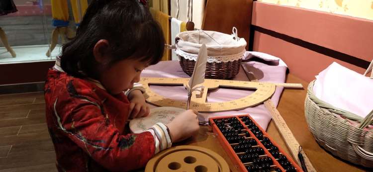 “布铃铃旗袍行”里,小姑娘正在用羽毛笔认真地画着刺绣的花样。