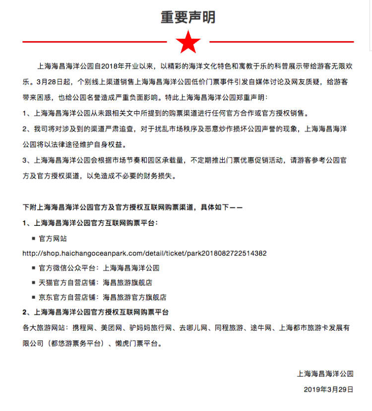 不过,今天中午,海昌公园相关负责人向记者否认了这些说法。公园品牌部相关负责人说,这些旅行社不是公园官方授权销售渠道,他们“将对涉及到的渠道严肃追查,对于扰乱市场秩序及恶意炒作损坏公园声誉的现象,上海海昌海洋公园将以法律途径维护自身权益。”