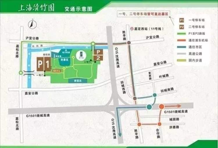 祭扫市民驾车可从嘉松北路进入P1停车场,从沪宜公路进入P2停车场。