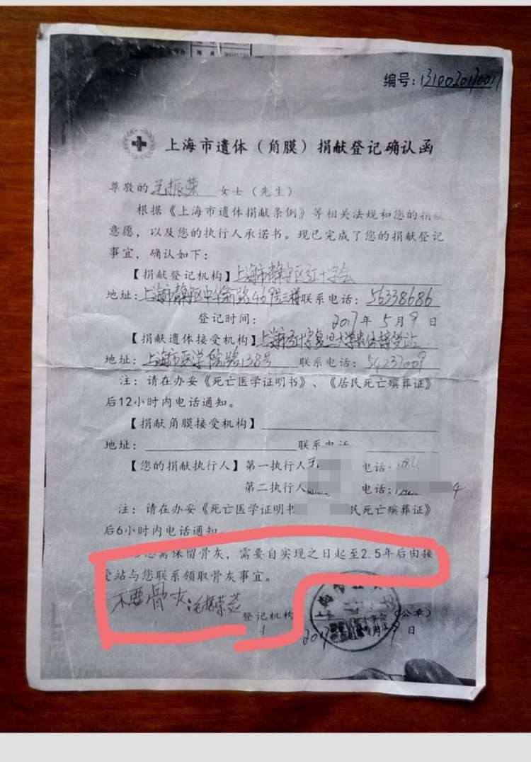 2018 年,毛振荣胆囊癌复发,他再次要求将遗体(角膜)捐献向上海市红十字会,向家人提出想要兑现承诺。捐献遗体不是一件小事,光本人同意不行,还要子女、妻子(即捐献遗体的执行人)同意。当妻子得知毛振荣要捐献遗体,说啥都不舍得:“因为,我们夫妻一场,很有感情,健在是夫妻,来世还做夫妻。”毛振荣听后做了妻子的工作:“只要心中互相有对方,即是我先走一步,我会在那里祈祷上帝保佑您健健康康。世上没有不死的人,万一你也去了那里,我们仍然是一对恩爱夫妻,你就答应我吧。”妻子自知拗不过他,也是为了他能一路走好。于是就答应了毛振荣的心愿。毛振荣还有一点点不放心,请阳曲路570弄居委会主任胡冬梅在上海市红十字会复旦大学遗体接受站做了遗体见证人。并在《上海市遗体(角膜)捐献登记确认函》上签字画押“不要骨灰”这四个金光闪闪的大字。其实,按规定二年半后可以与接受单位联系领取骨灰事宜的。