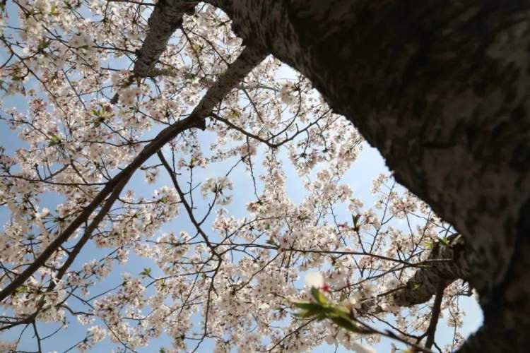 染井吉野已绽放,在阳光下,在微风中,向着四面八方的游客频频招手,真的是灿若云霞,光芒四射,满树繁花,蔚为壮观。