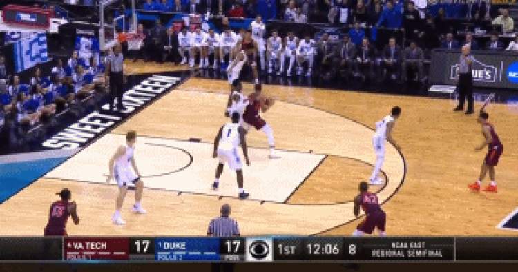 当比赛还剩下1秒时,弗吉尼亚理工大学的战术完全被跑了出来,可惜进攻球员错失了近在咫尺的空接,杜克惊险过关,成功挺进八强。