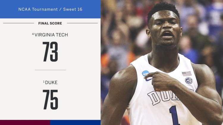 在另一场焦点战,杜克对阵弗吉尼亚理工大学的比赛中,凭借着锡安23分5篮板3盖帽的发挥,杜克大学75-73险胜弗吉尼亚理工大学。