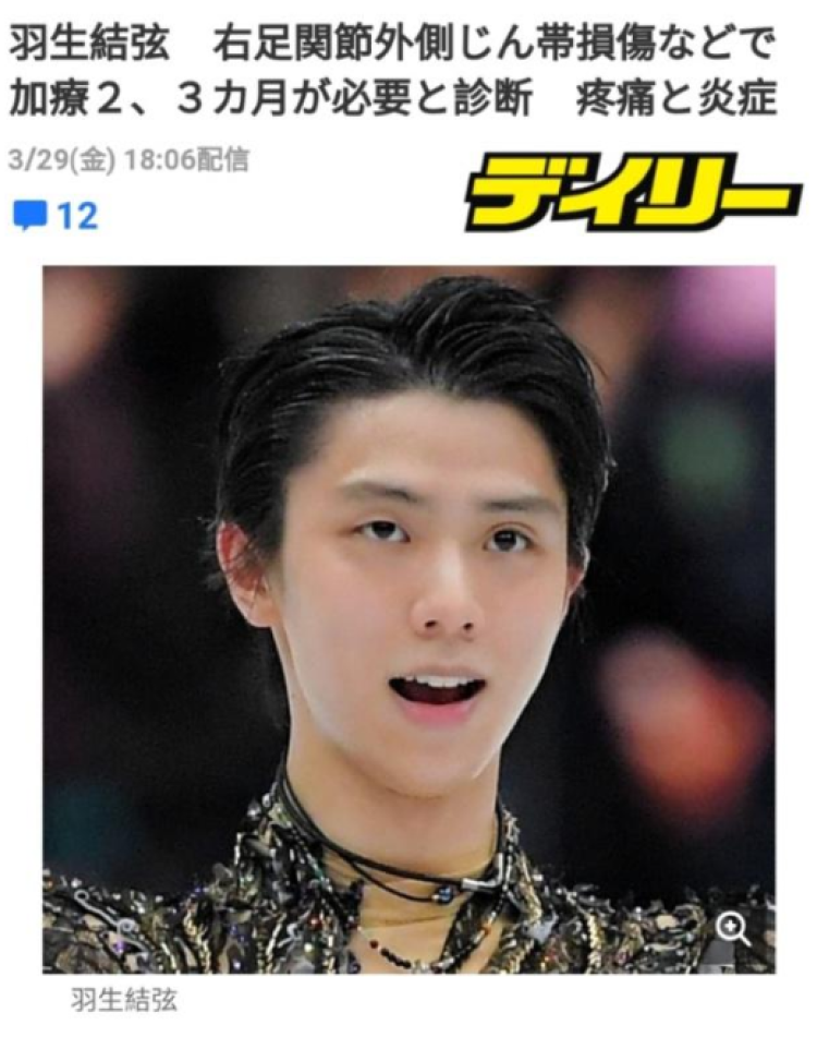 昨晚,日本滑冰联盟公布了羽生结弦最新伤情,他被诊断为右脚关节外侧韧带损伤、三角韧带损伤,以及右腓骨肌腱损伤,仍需休养2到3个月。
