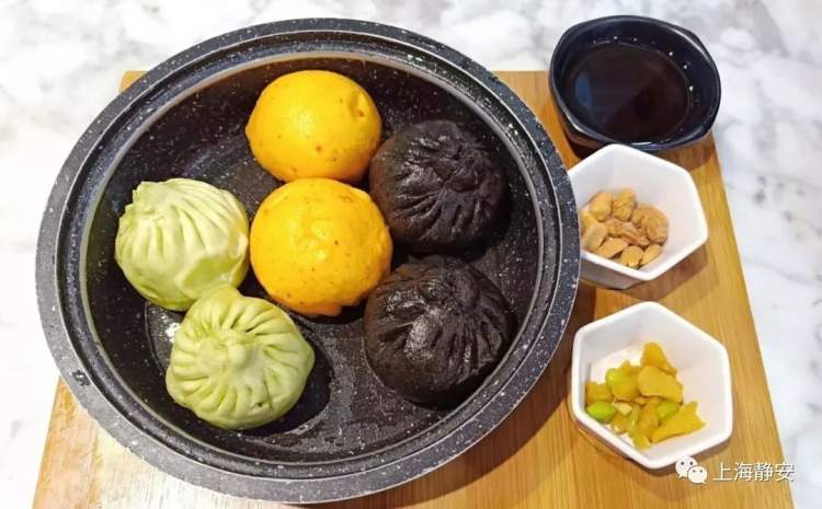 他们家主打三色生煎,按口味和馅料区分颜色。白色是鲜肉的,绿色是荠菜的,黑色的口味很新奇,是芝士鳕鱼。