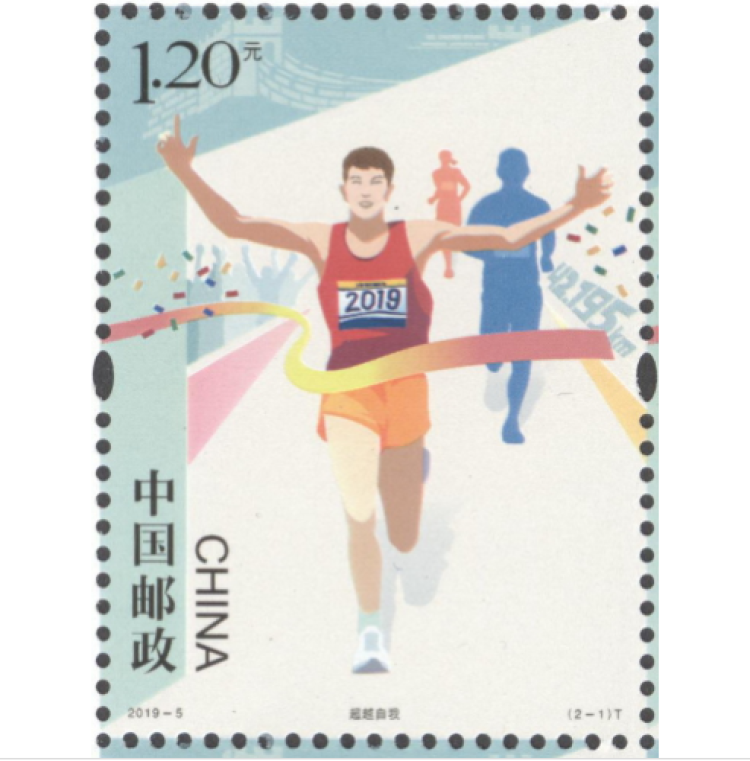 邮票第一图通过描绘马拉松运动员撞线的瞬间动态形象和背后欢呼的观赛人群,配合全程马拉松的里程数,突出了“挑战自我、超越极限、坚韧不拔、永不放弃”的马拉松精神。