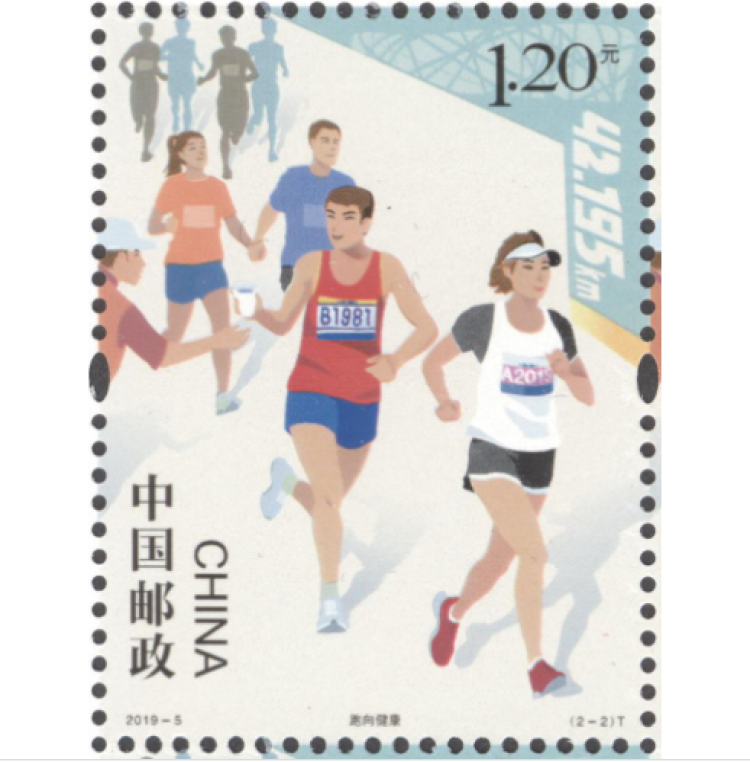 邮票第二图描绘了一组参赛选手的运动英姿,配合志愿者递水的情景,体现出马拉松运动“全民参与、互帮互助”的独特魅力,也展现出“跑向健康”的健康生活理念。