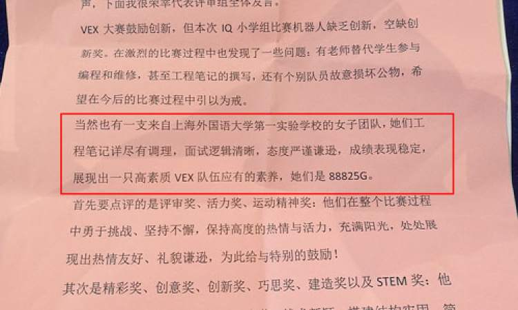 大赛评审长这样评价这支女队:“这支来自上海外国语大学第一实验学校的女子团队,她们工程笔记详细有条理,面试逻辑清晰,态度严谨谦逊,成绩表现稳定,展现出一支高素质VEX队伍应有的素养,她们是88825G。”