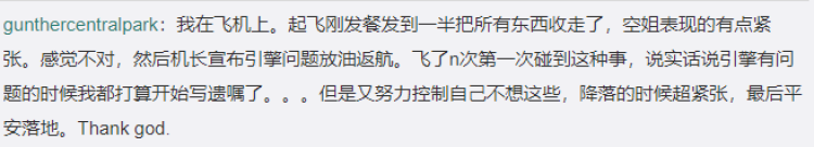 在飞机上。起飞刚发餐发到一半把所有东西收走了,空姐表现的有点紧张。感觉不对,然后机长宣布引擎问题放油返航。飞了n次第一次碰到这种事,说实话说引擎有问题的时候我都打算开始写遗嘱了……但是又努力控制自己不想这些,降落的时候超紧张,最后平安落地。