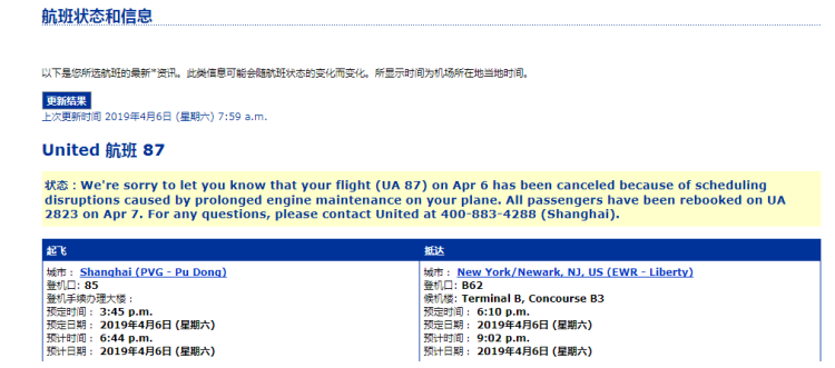 对此,美联航官网也更新了该航班信息。美联航表示,机务人员需要对执飞该航班的飞机其中一台引擎进行评估。目前由于飞机引擎需要维修,UA87航班已经取消,旅客将被改签至7日的UA2823航班。