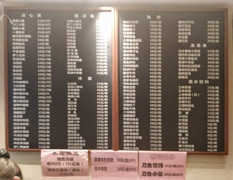 先去更「大路」的富春小笼打打样吧!纵使是夜间,富春小笼依旧挤满了吃点心的人,还不断地有人往楼上的点餐区域走去。门口一「黑板」的日常菜单下,粉红色的时令菜单变得尤为显眼——特色田螺、活杀三黄鸡、蛋黄肉松青团、豆沙青团、刀鱼馄饨、刀鱼小笼,哪个不让人想尝尝鲜?