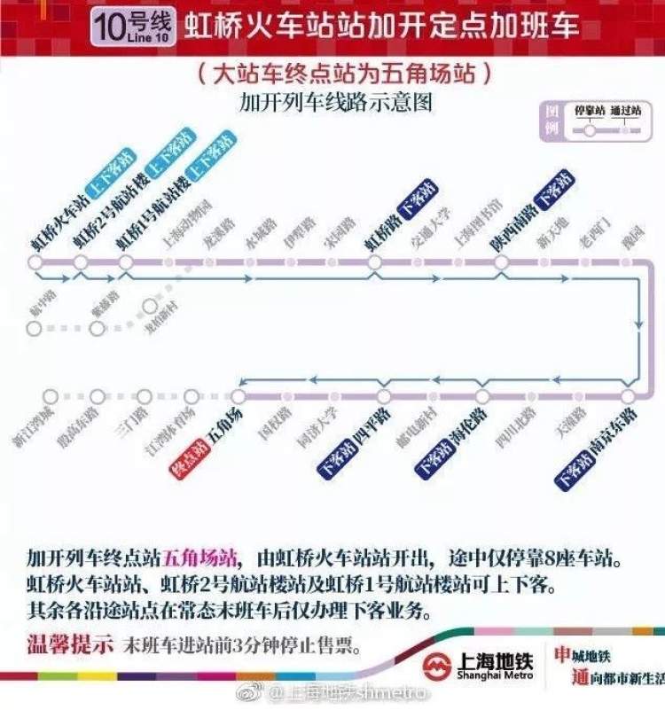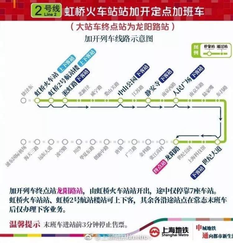 清明出去嗨,半夜才回到上海?轨交2、10号线定点加班车送你回家! 上海发布 2019-4-07 来源:周到上海 为保障4月7日虹桥火车站夜间到达旅客的出行需求,今晚地铁2号线定点加班车加开至4月8日凌晨0时30分,运行区段为虹桥火车站至龙阳路,沿途停靠虹桥2号航站楼、淞虹路、中山公园、静安寺、人民广场、世纪大道、龙阳路;地铁10号线定点加班车加开至23时30分,运行区段为虹桥火车站至五角场,沿途停靠虹桥2号航站楼、虹桥1号航站楼、虹桥路、陕西南路、南京东路、海伦路、四平路、五角场。 地铁2号线 地铁10号线 来源:周到上海 作者:上海发布 赞一个 (0)