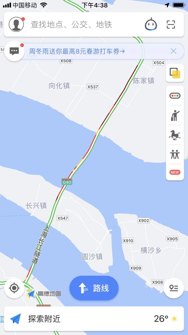 今天上午,上海长江隧桥基本通畅,仅陈海公路收费口和长兴岛服务区一小段红色拥堵。但是午饭后,拥堵逐步加剧,红色拥堵范围逐渐从陈海公路收费口、长兴岛服务区扩大至整个大桥桥面,以及从启东方向距离陈海公路收费口5公里处、隧道内部分路段、高东收费口。